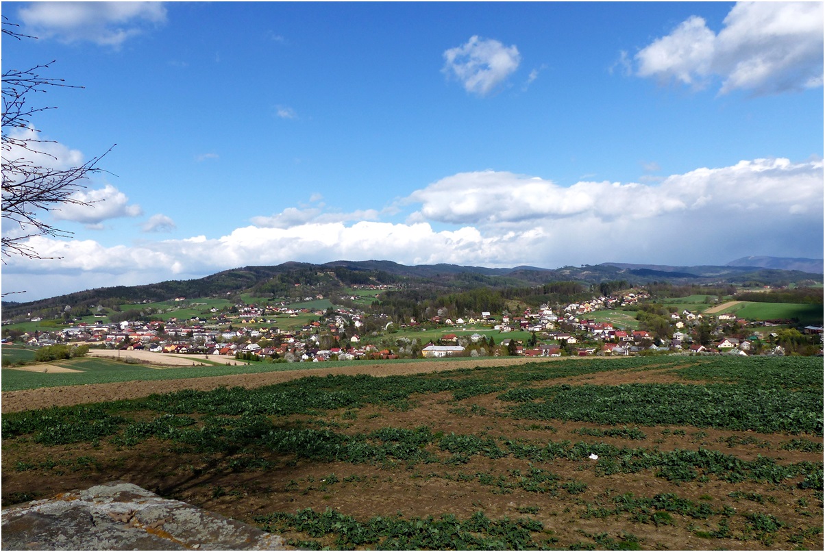 Je odtud krásný výhled, ale město máme zrovna proti slunci a to se fotí špatně. Ale je vidět na obec Krhová, i na naši zahrádku.