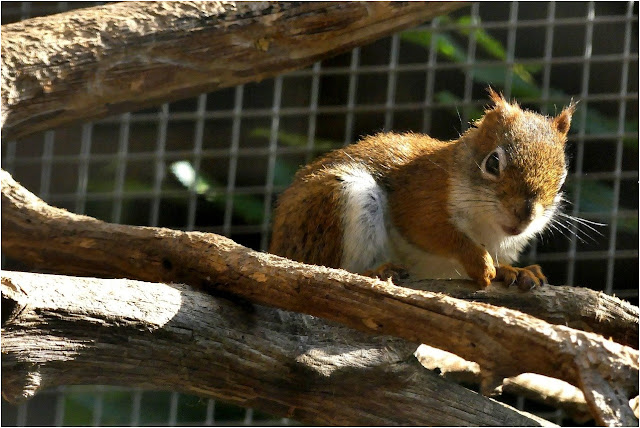 S veverkou čikari hned u vchodu je vždycky legrace. Je živá a rozhodně nehodlá pózovat, natož čekat, až si foťák připravíte na focení přes docela husté pletivo výběhu. Focení je tedy docela lov. "Tam je!!!...